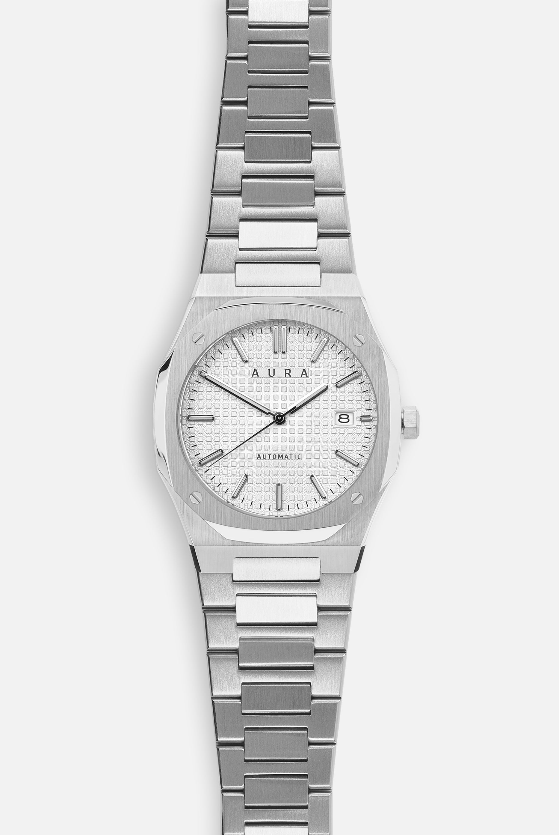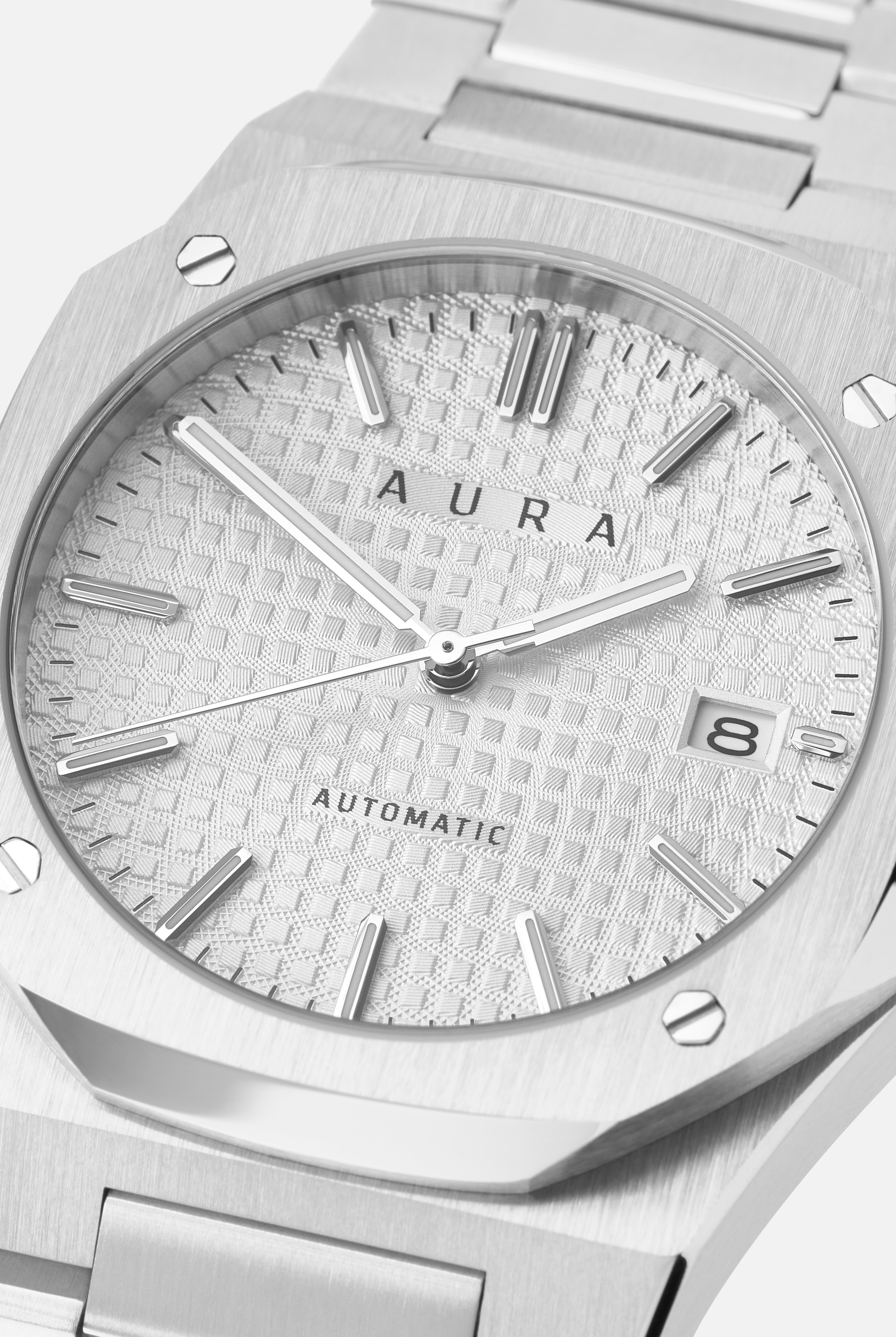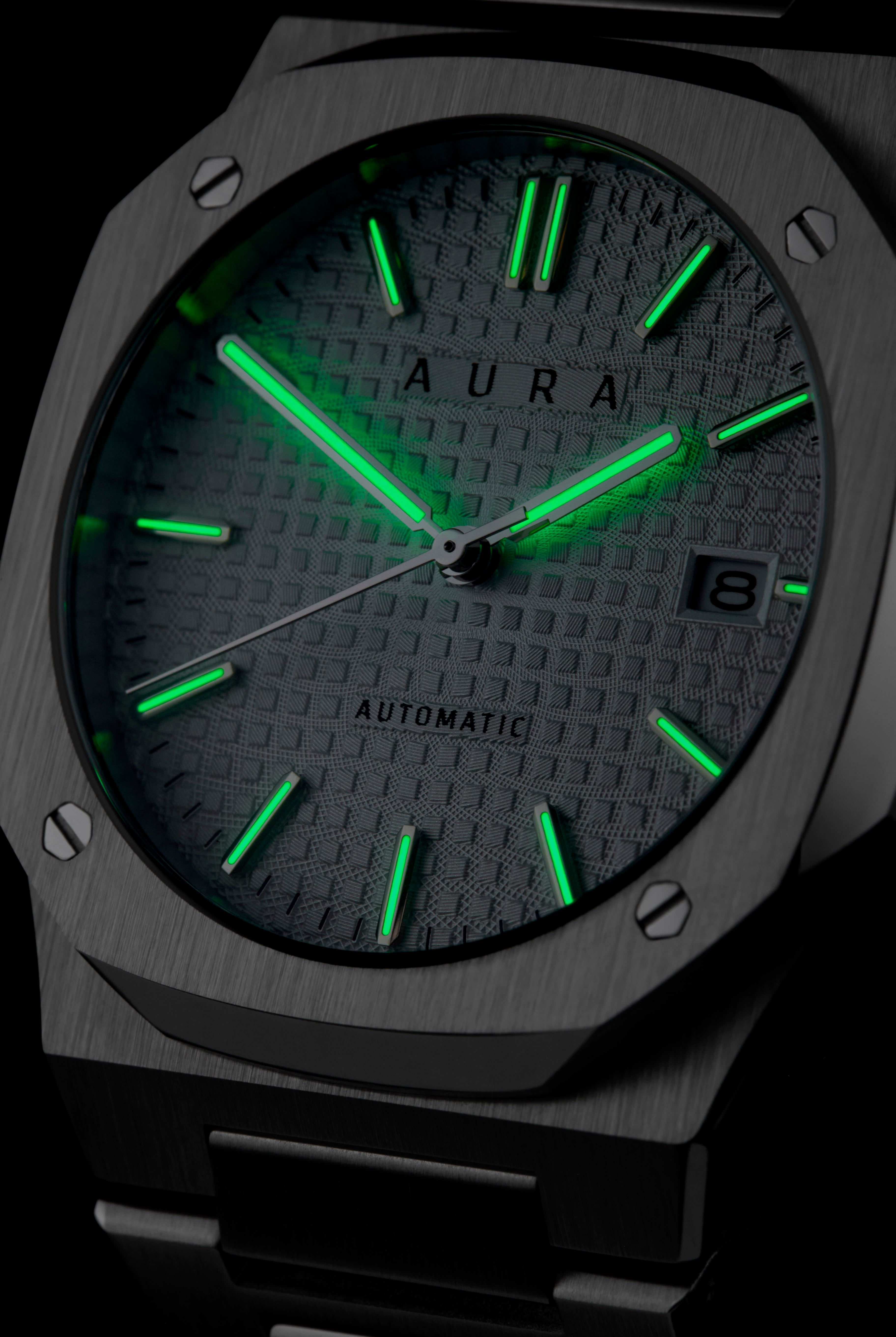 The Aura Date showcases a Seiko Japan NH35A self-winding movement, encased in brushed and polished steel all centered around a captivating guilloché dial.
