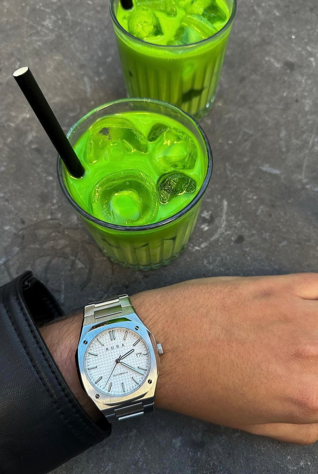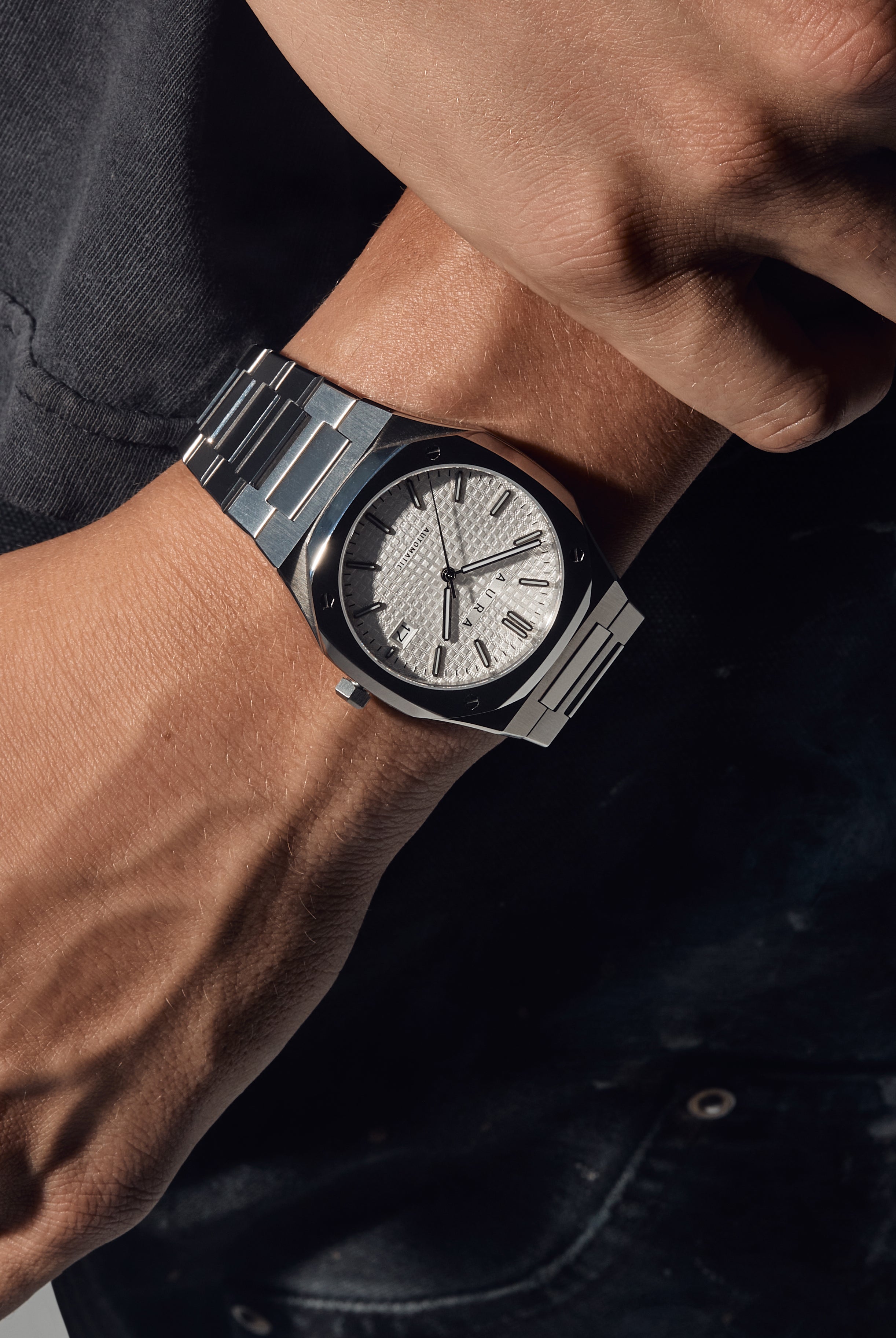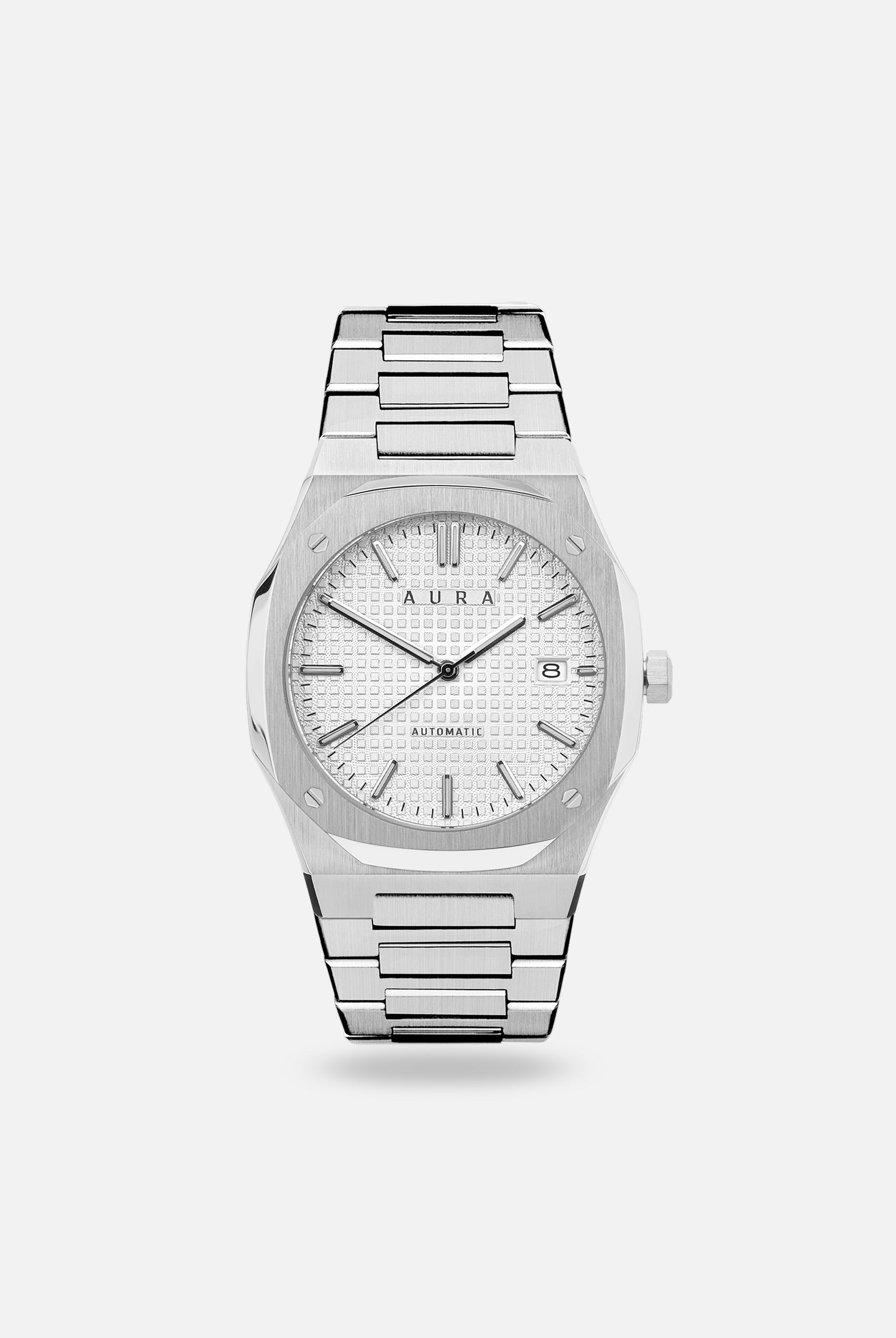 The Aura Date showcases a Seiko Japan NH35A self-winding movement, encased in brushed and polished steel all centered around a captivating guilloché dial.