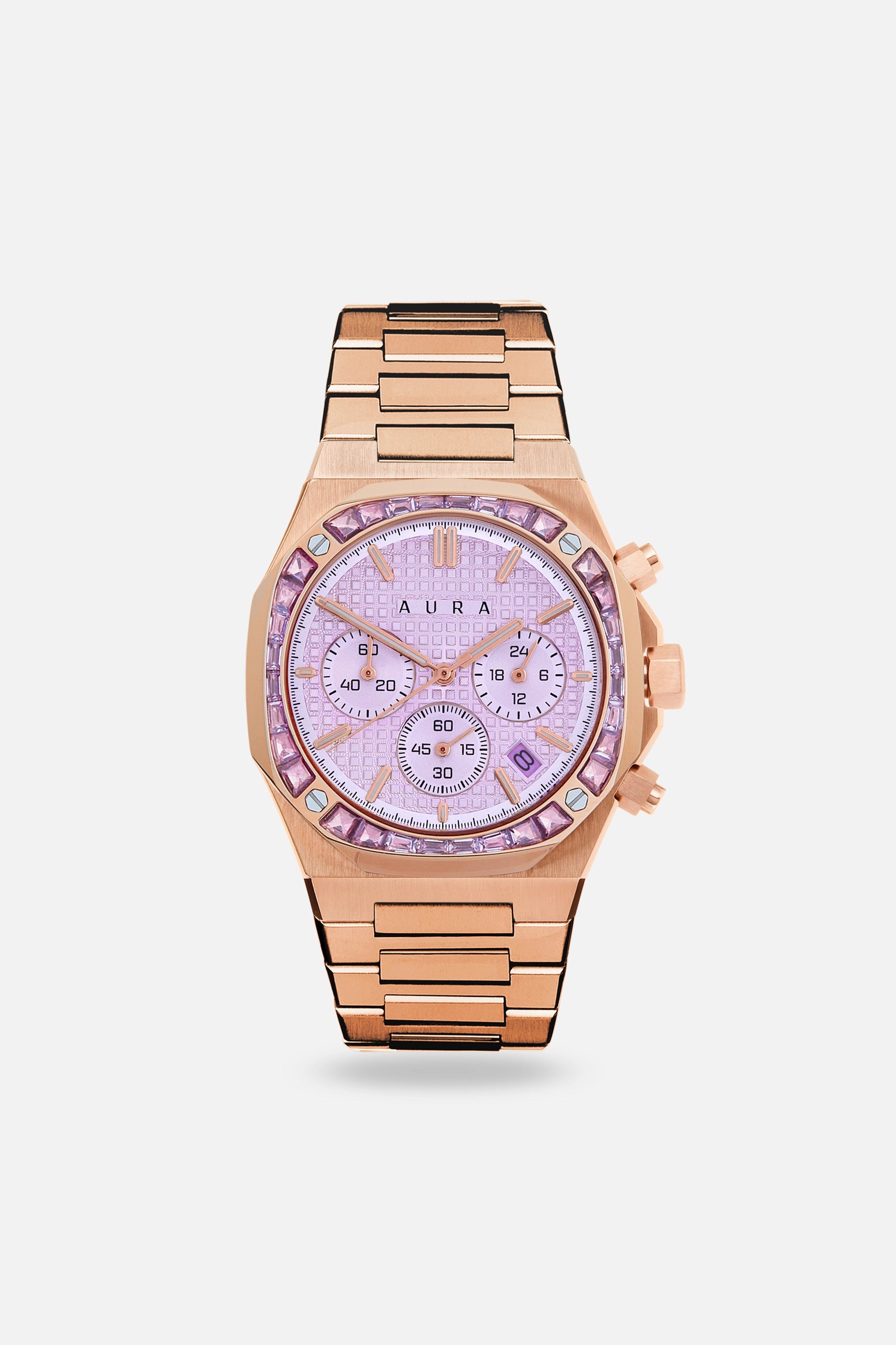 With only 150 pieces made, this Limited Edition watch transcends the ordinary with its adorned bezel, where beautiful lavender-colored crystals are meticulously hand-set, adding an extra layer of sophistication and allure.