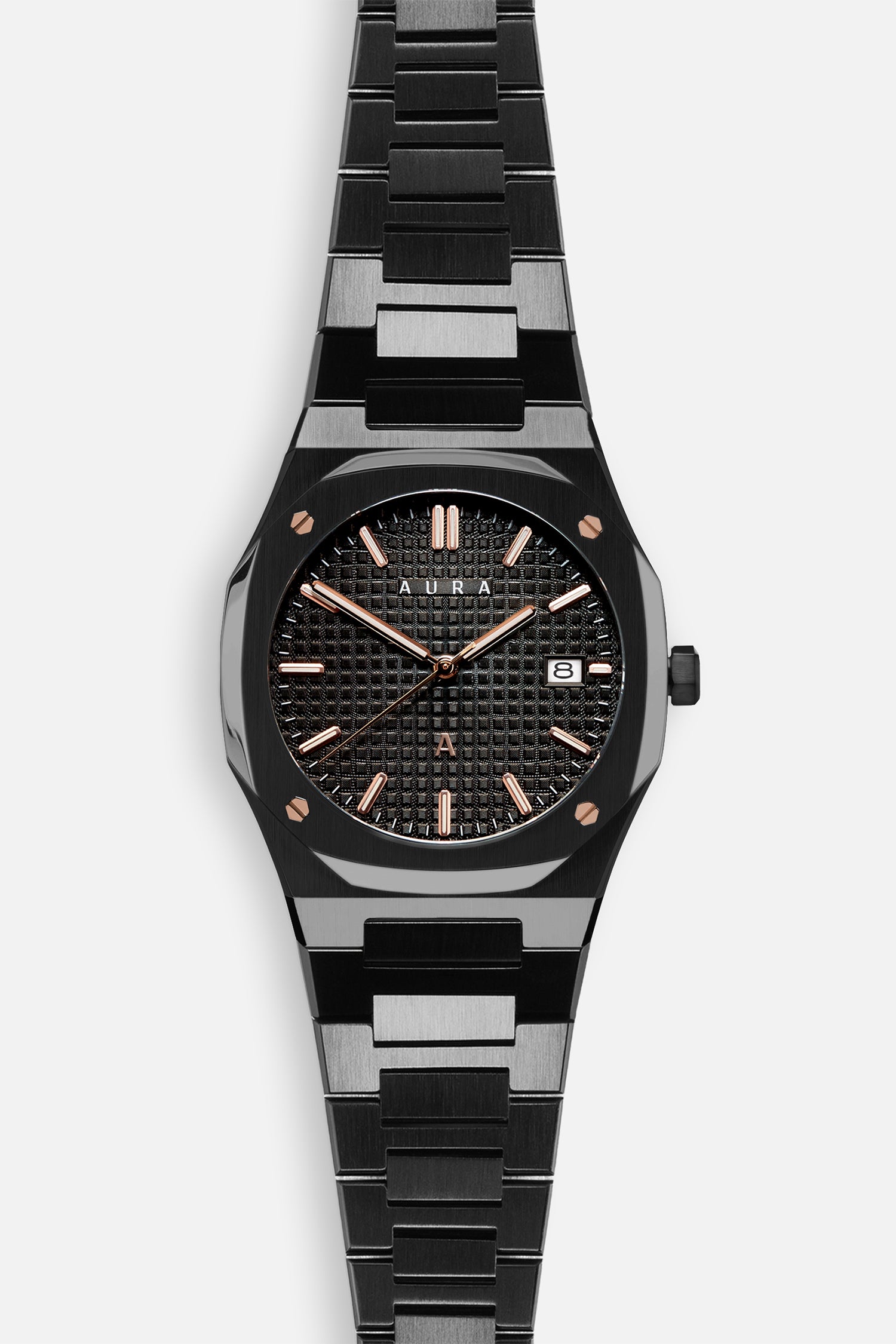 The Aura Date stands out as our most classic design, embodying sophistication and luxury with its timeless elegance. For a more relaxed style, it can easily be matched with an FKM strap. The Date 002: Black/Rose features a Seiko Japan NH35A self-winding movement, housed in a blend of brushed and polished steel, and highlights a stunning guilloché dial.