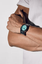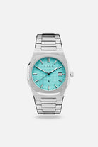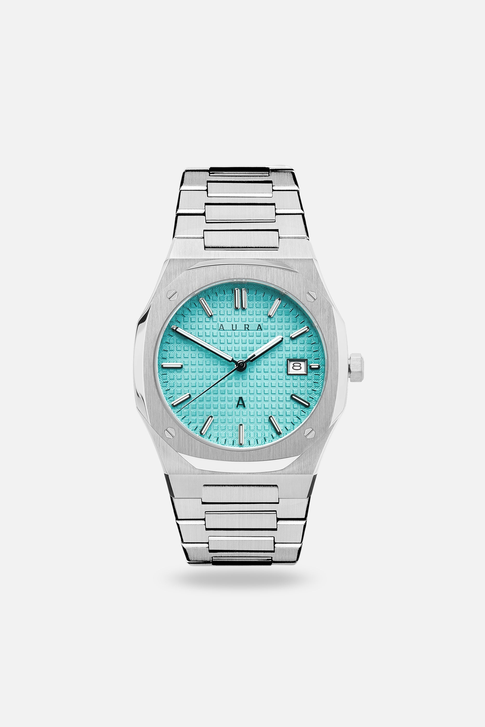 The Aura Date stands out as our most classic design, embodying sophistication and luxury with its timeless elegance. For a more relaxed style, it can easily be matched with an FKM strap. The Date 002: Steel/Turquoise features a Seiko Japan NH35A self-winding movement, housed in a blend of brushed and polished steel, and highlights a stunning guilloché dial.