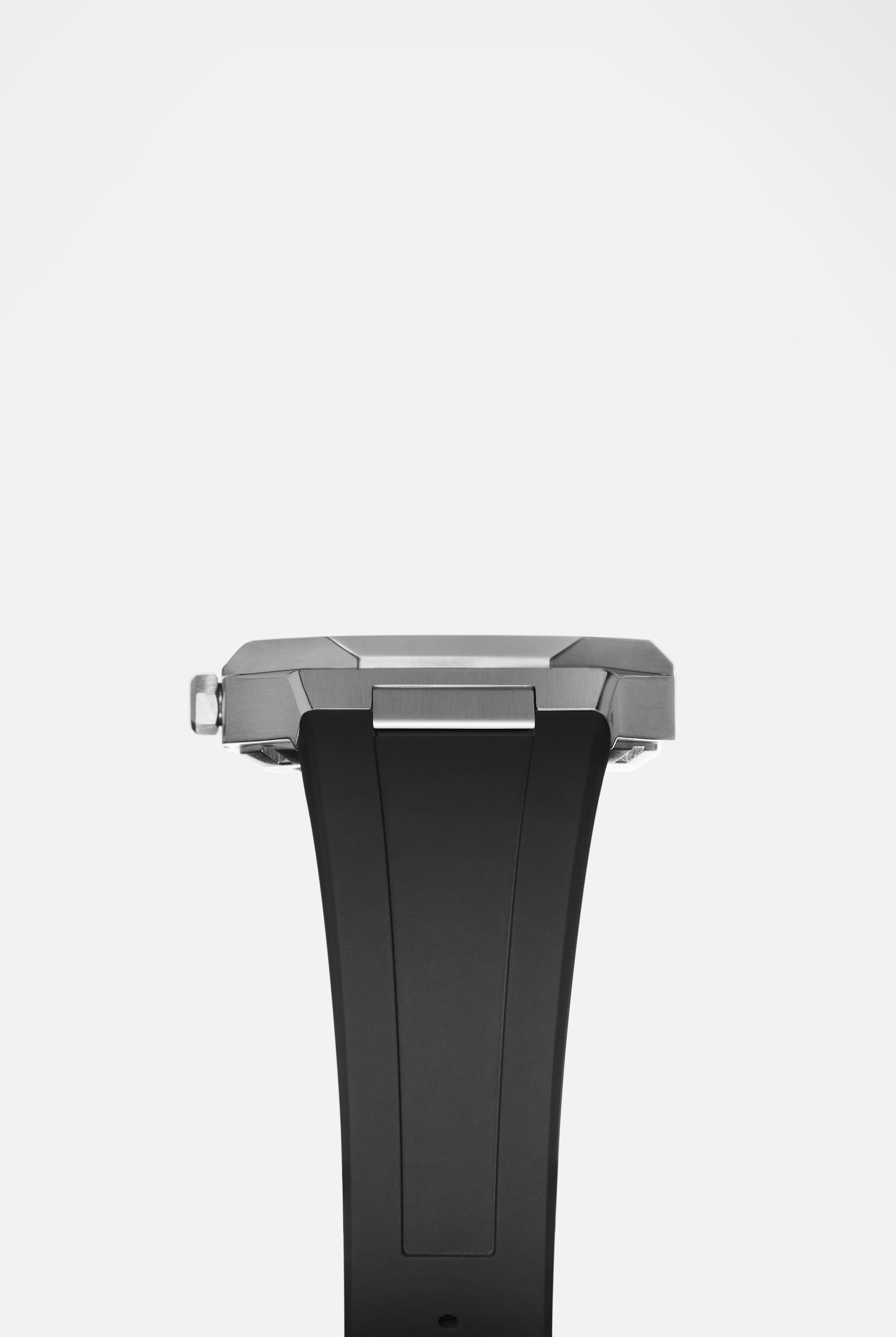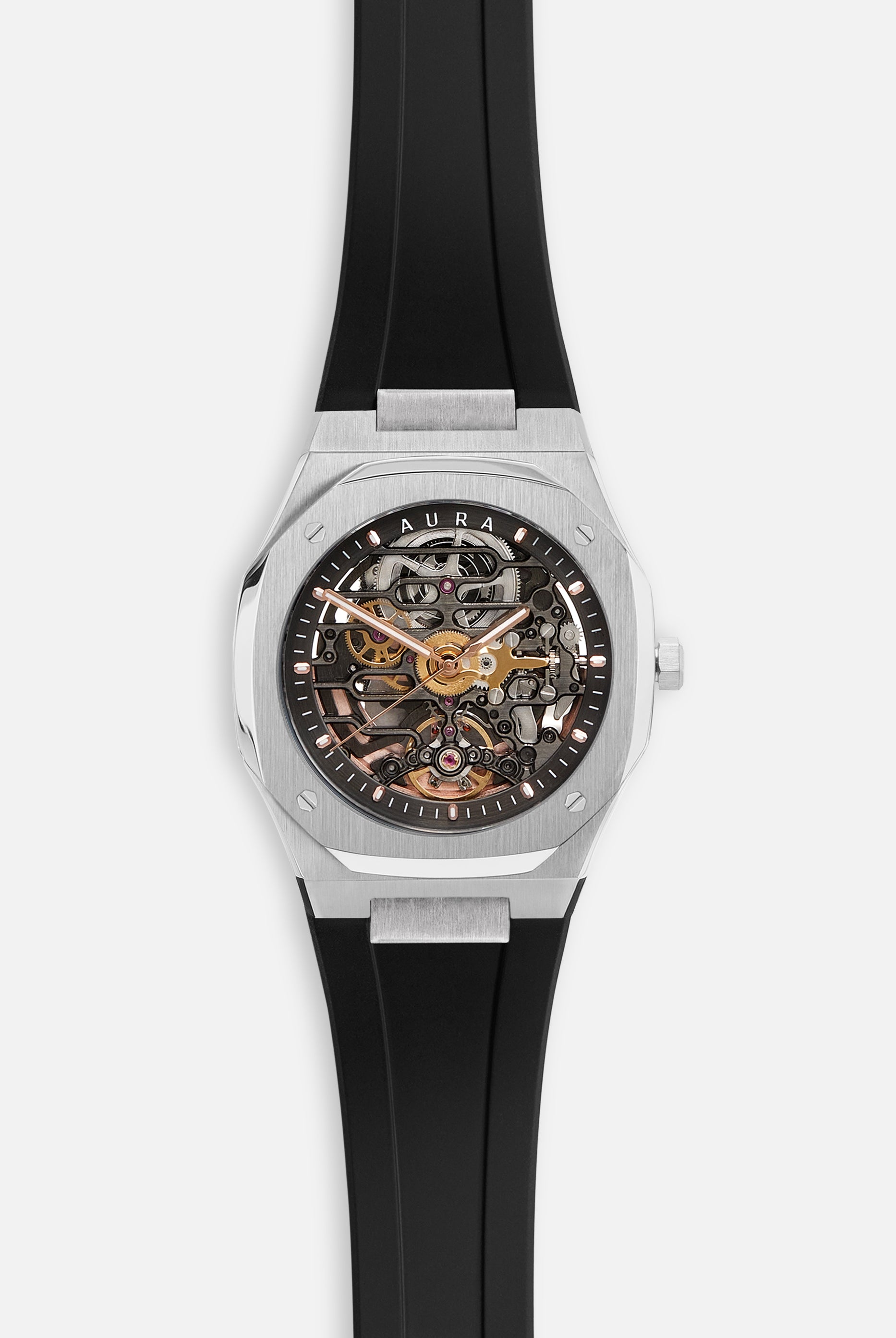 Distinguished by its captivating self‑winding transparent skeleton movement and resilient stainless steel case and integrated steel bracelet.