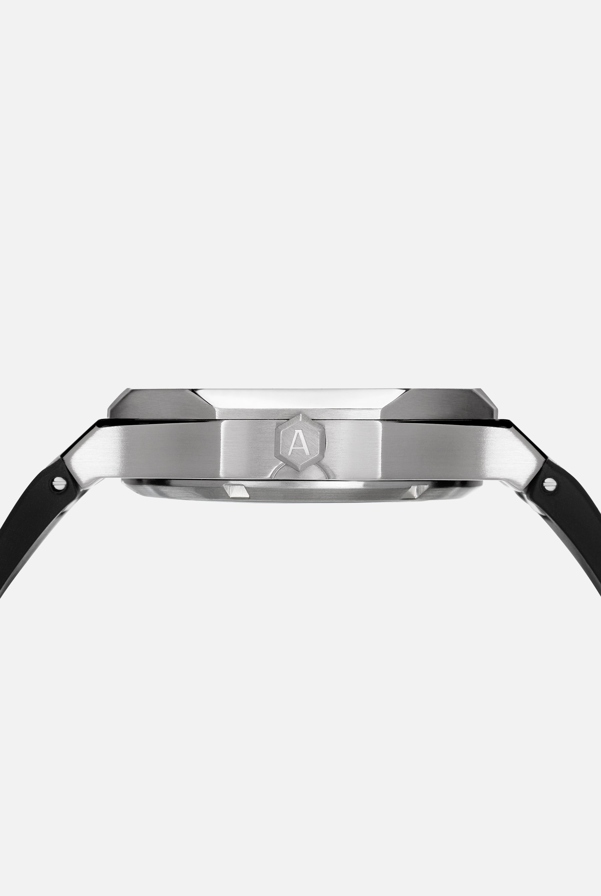 The Aura Date showcases a Seiko Japan NH35A self‑winding movement, encased in brushed and polished steel all centered around a captivating guilloché dial.