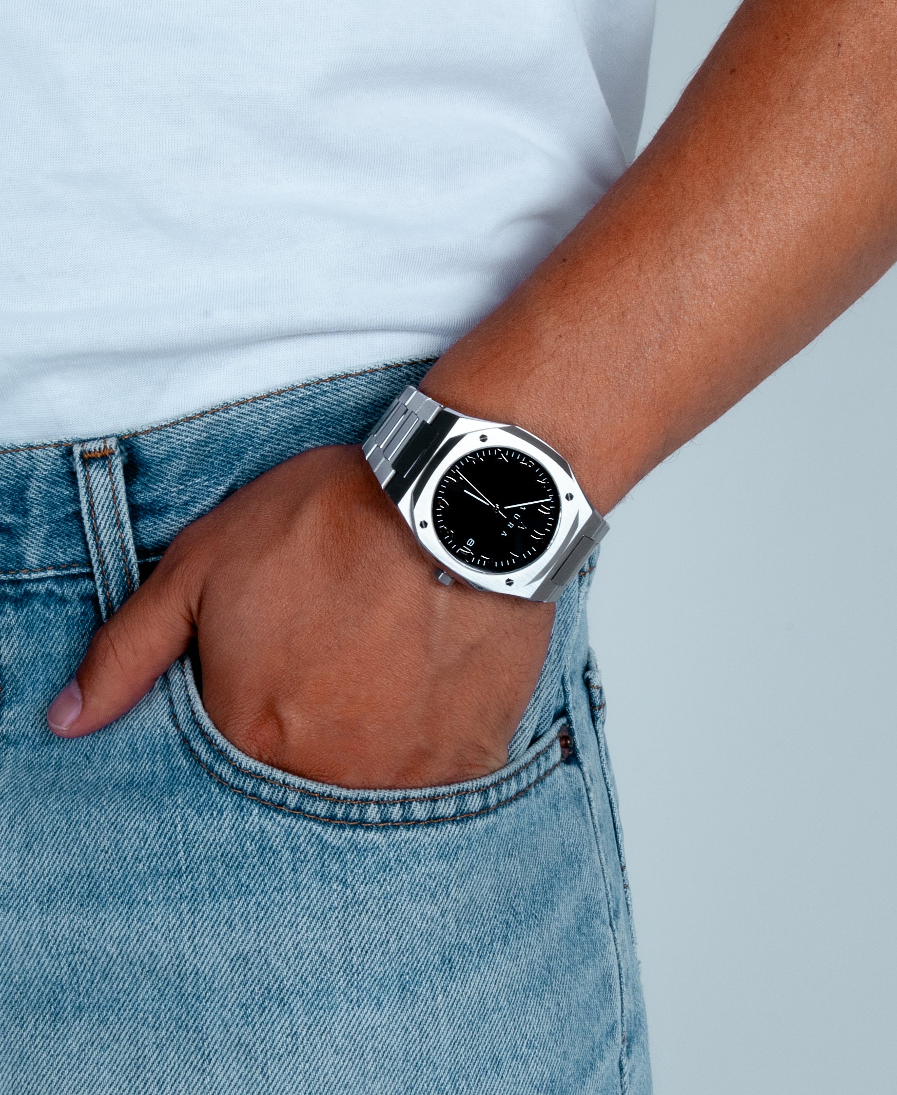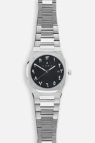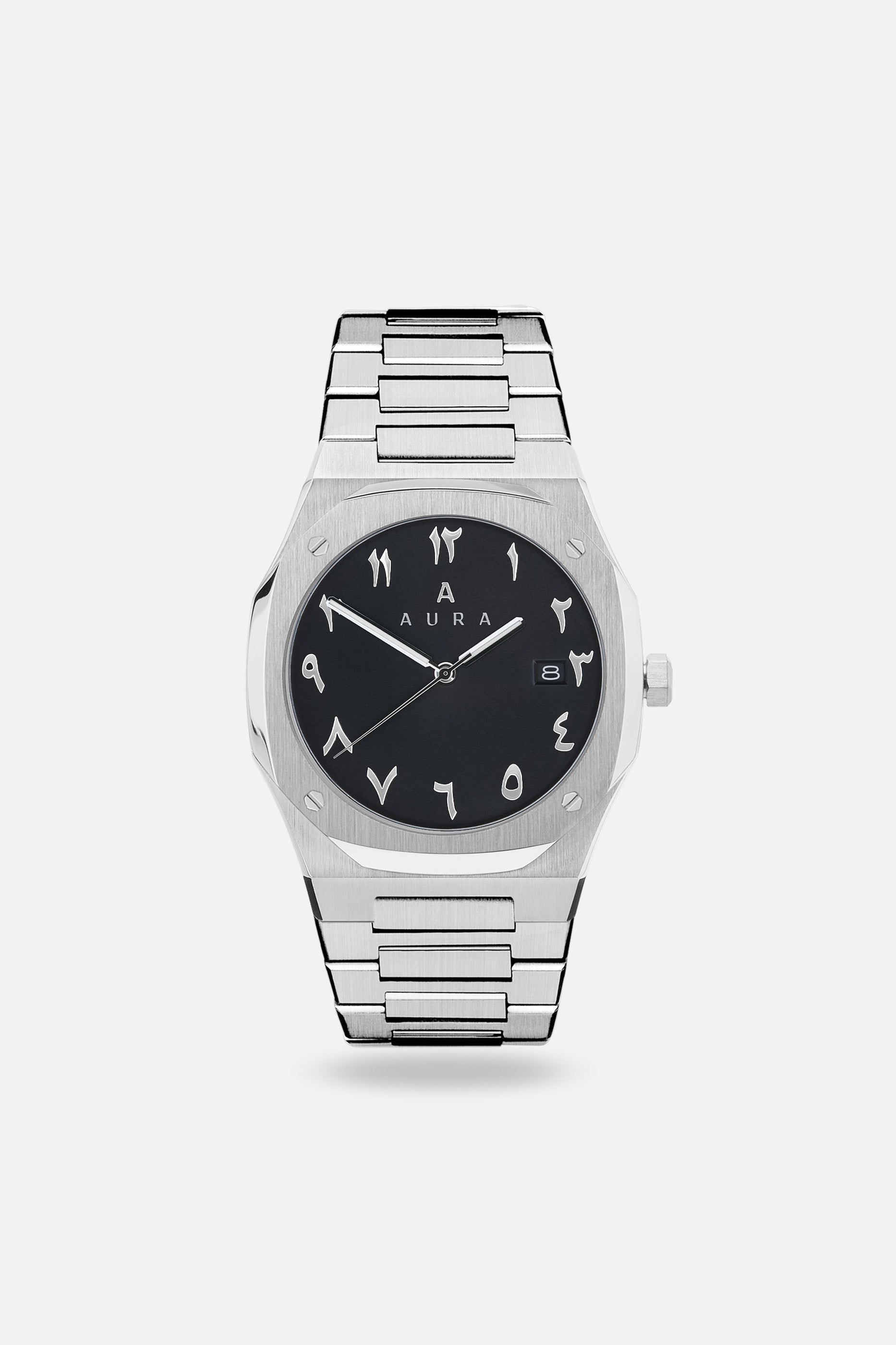 The Aura Date stands out as our most classic design, embodying sophistication and luxury with its timeless elegance. The Date 003: Steel/Black Arabic features a Seiko Japan NH35A self-winding movement, housed in a blend of brushed and polished steel, and highlights a stunning sunburst pattern black dial with Arabic markers.