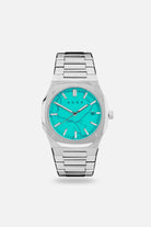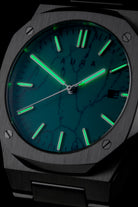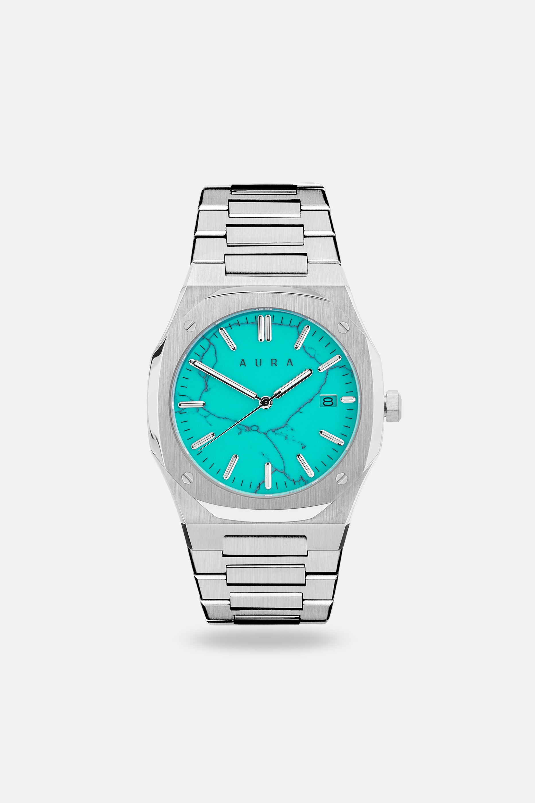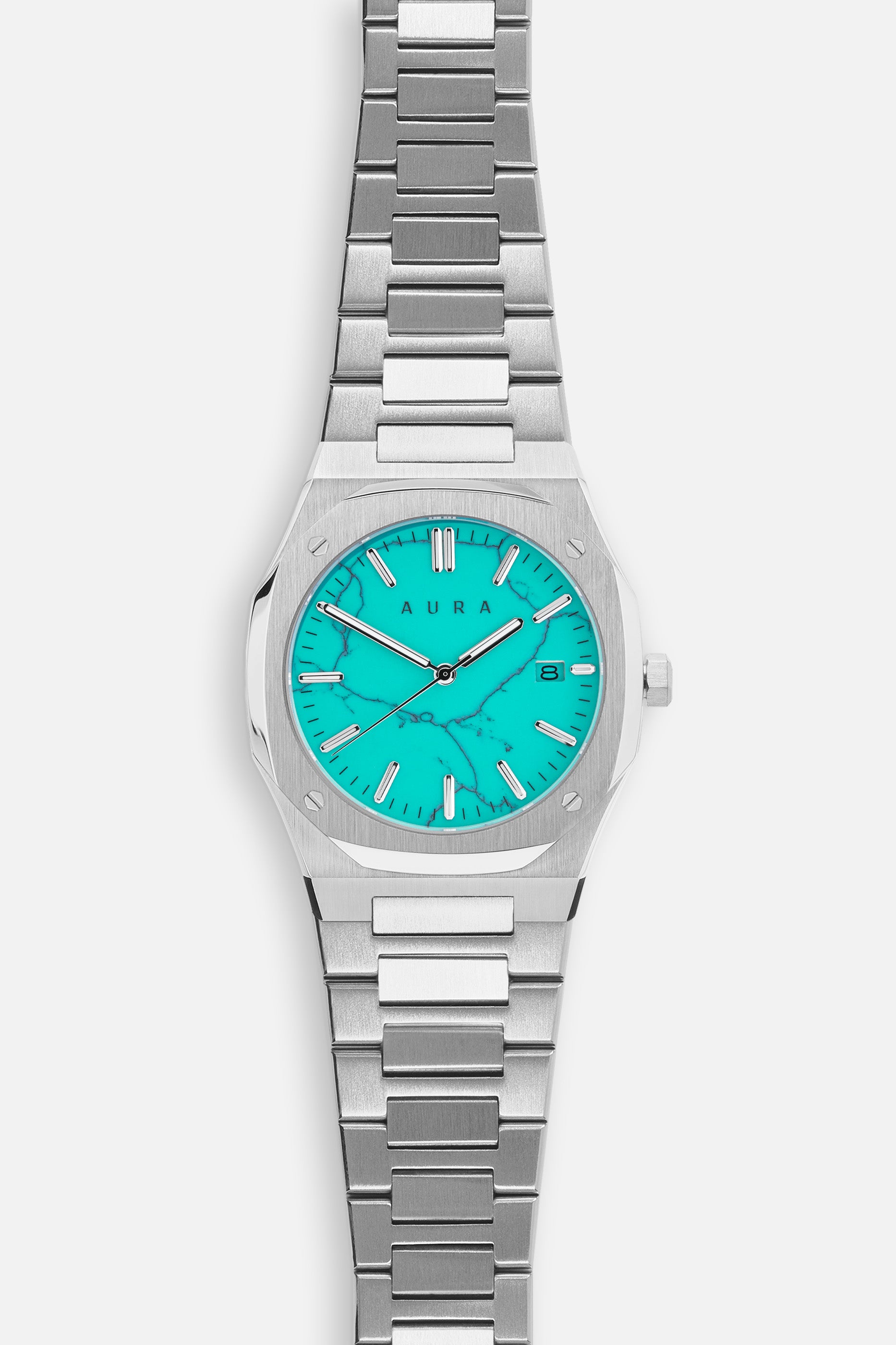 The Aura Date stands out as our most classic design, embodying sophistication and luxury with its timeless elegance. For a more relaxed style, it can easily be matched with an FKM strap. The Date 003: Steel/Turquoise features a Seiko Japan NH35A self-winding movement, housed in a blend of brushed and polished steel, and highlights a stunning marble-patterned dial.