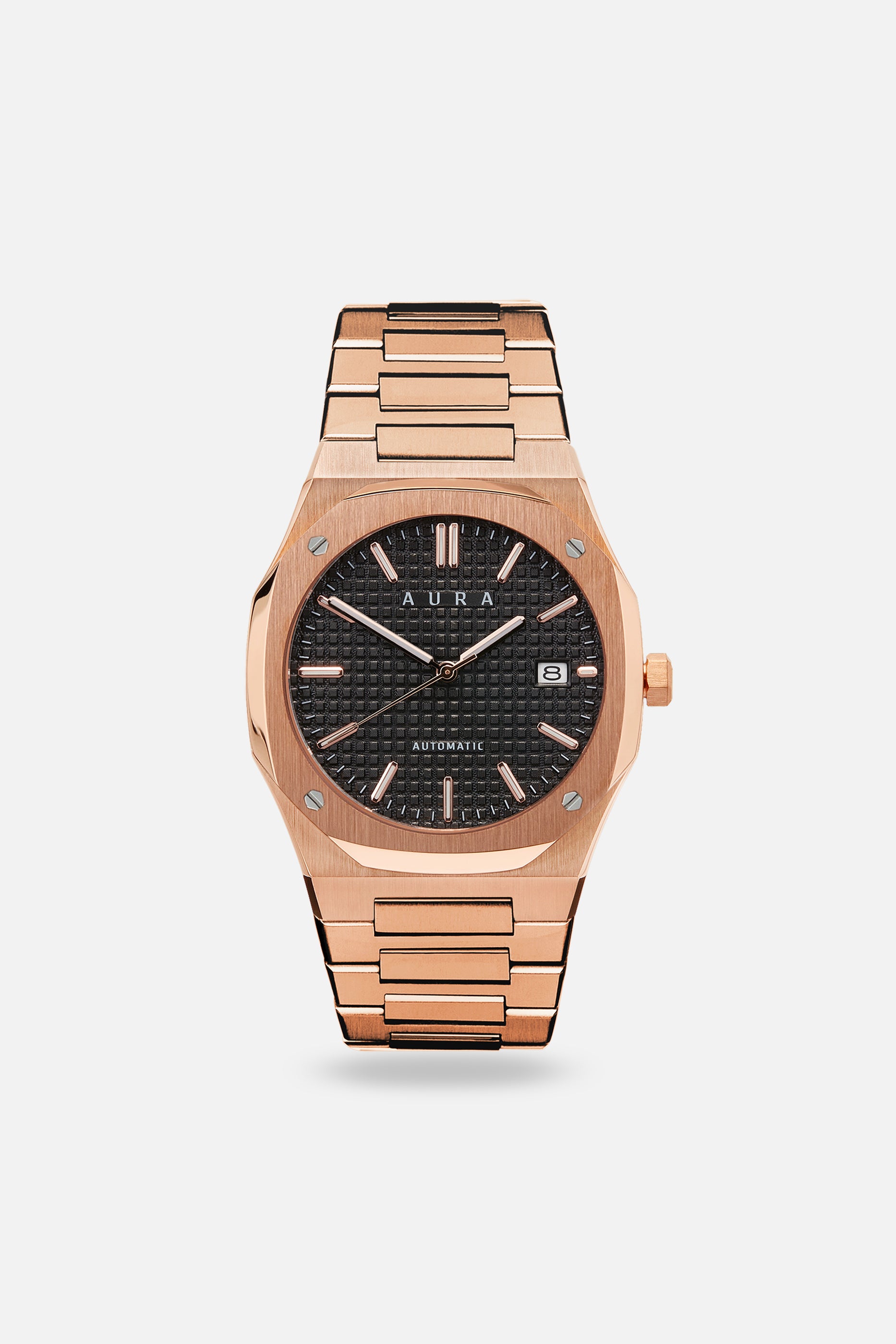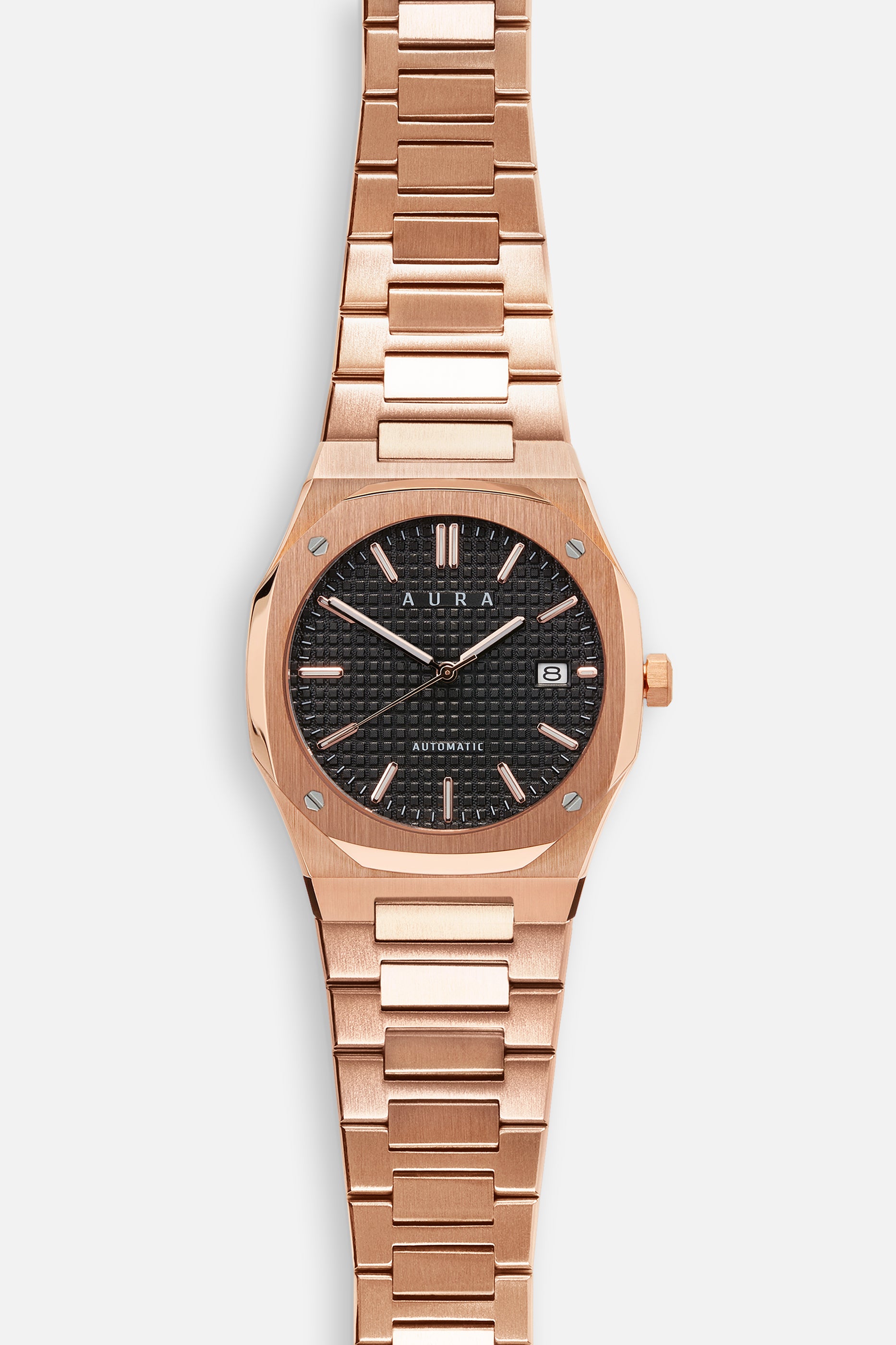 The Aura Date stands out as our most classic design, embodying sophistication and luxury with its timeless elegance. For a more relaxed style, it can easily be matched with an FKM strap. The Date 001: Rose/Black features a Seiko Japan NH35A self-winding movement, housed in a blend of brushed and polished steel, and highlights a stunning guilloché dial.