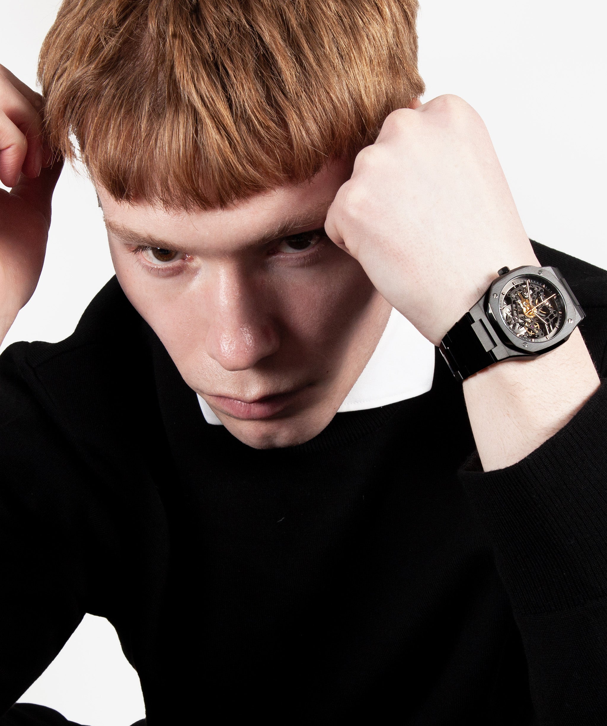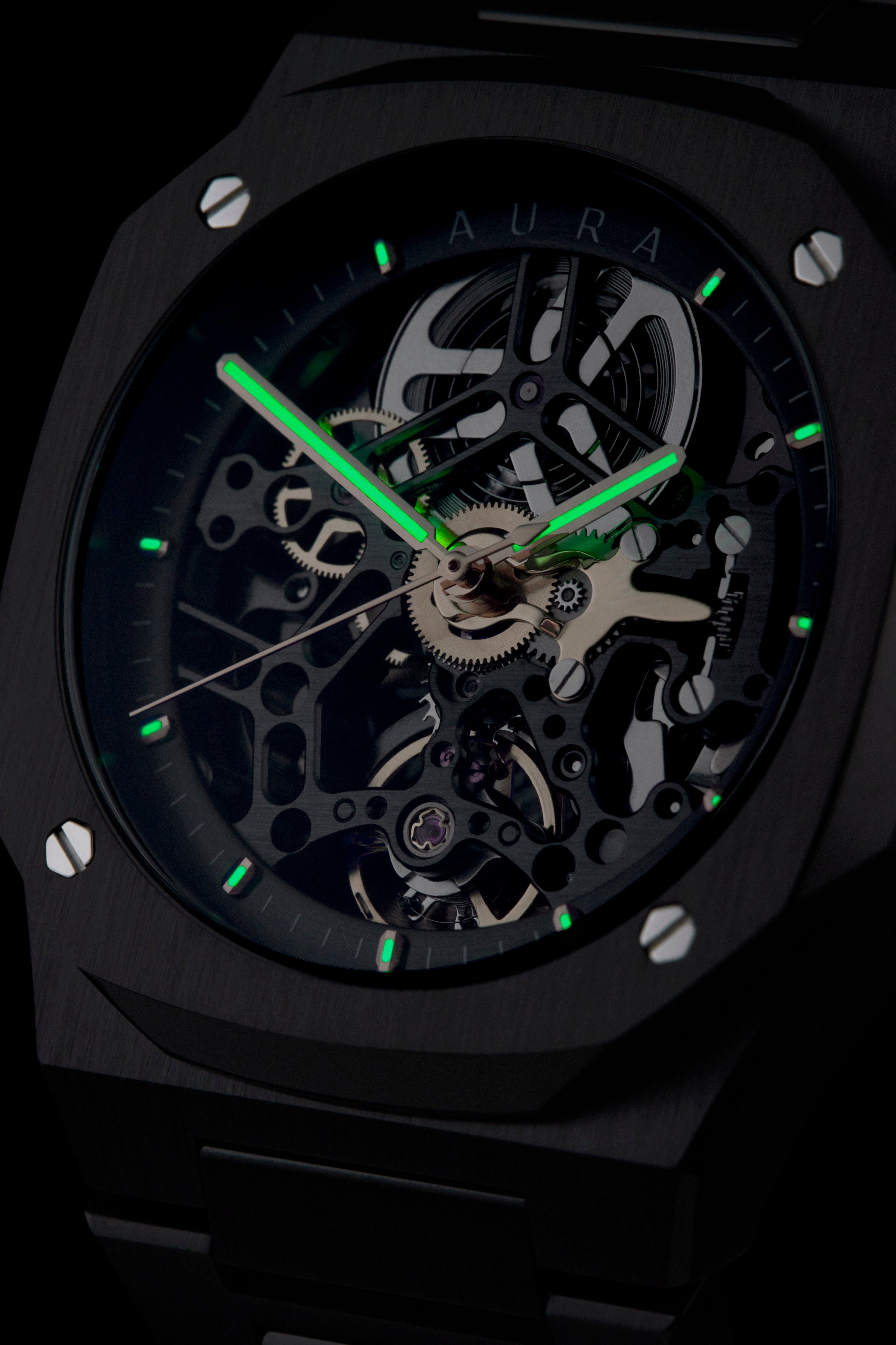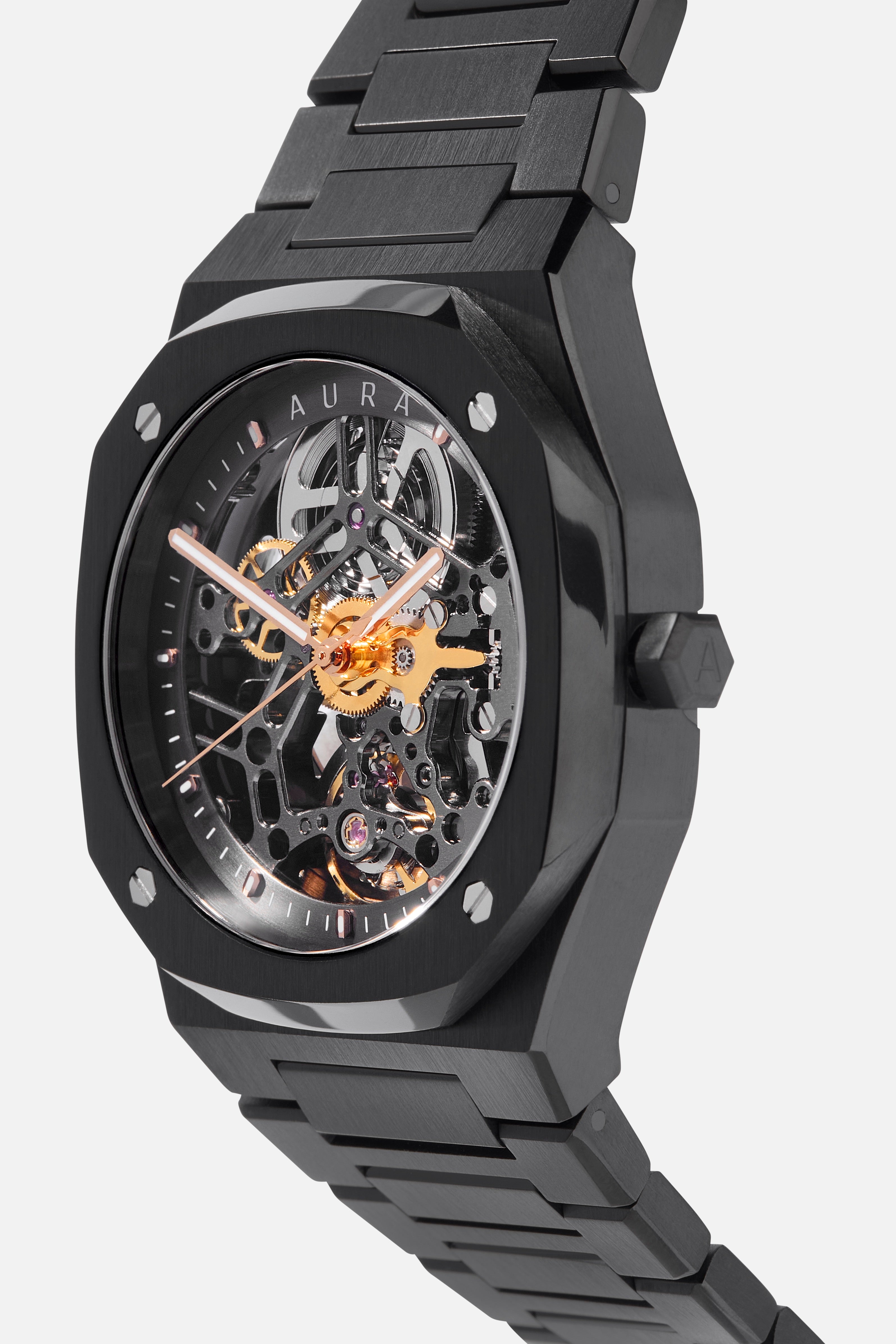 Introducing the latest iteration of our esteemed Skeleton series, the Skeleton 002: Black. This exceptional timepiece stands out with its mesmerizing self-winding transparent skeleton movement, offering a captivating glimpse into the intricate mechanics that power it. Crafted with utmost precision and durability in mind, its robust stainless steel case ensures longevity and resilience against the rigors of everyday wear. Complemented by an integrated steel bracelet, this watch exudes both sophistication and strength, making it a timeless accessory for the discerning connoisseur. Explore the fusion of innovation and elegance with the Stainless Steel Skeleton 002, a testament to our commitment to excellence in horology.